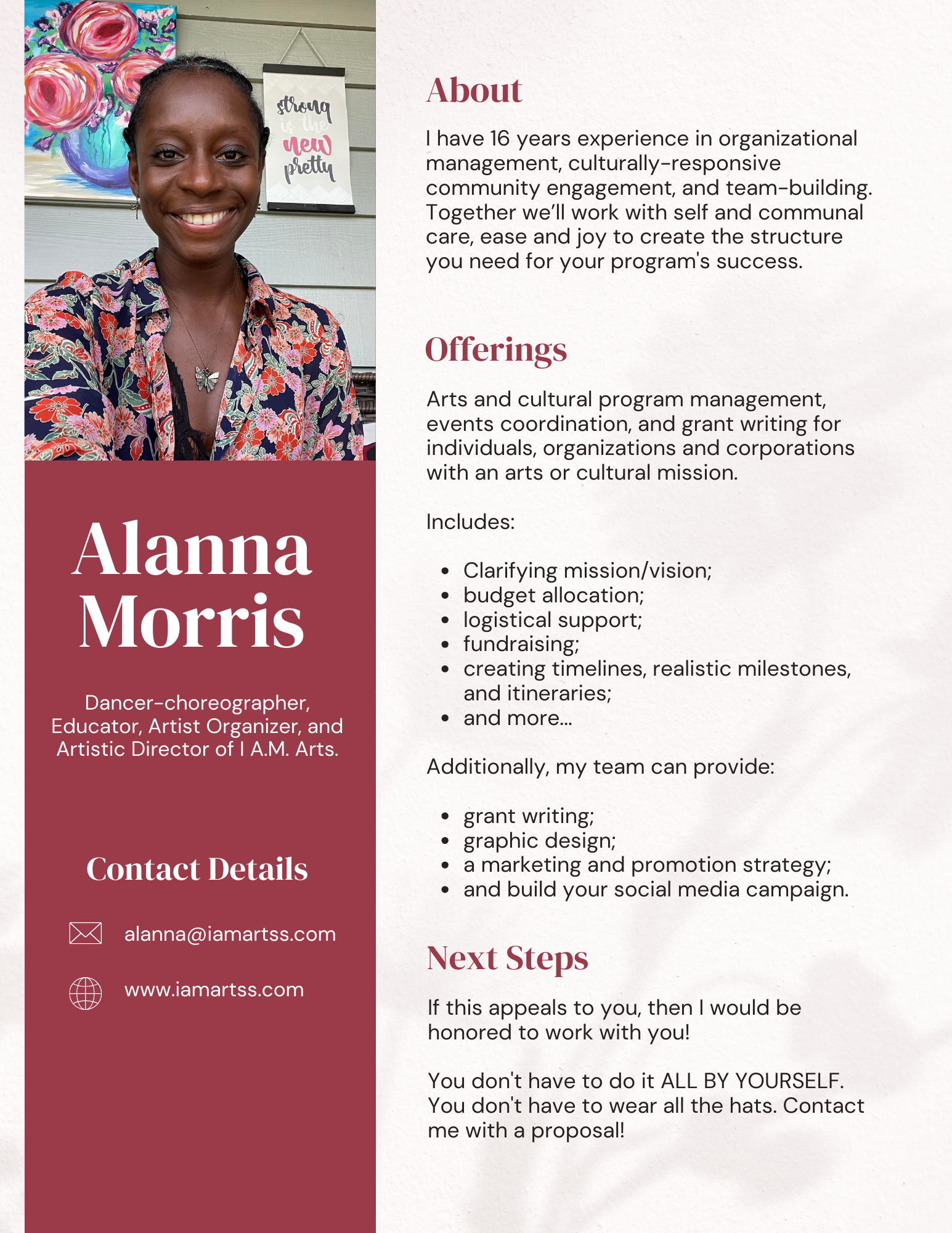 Arts and cultural program management, events coordination, and grant writing for individuals, organizations, and corporations with an arts or cultural mission.