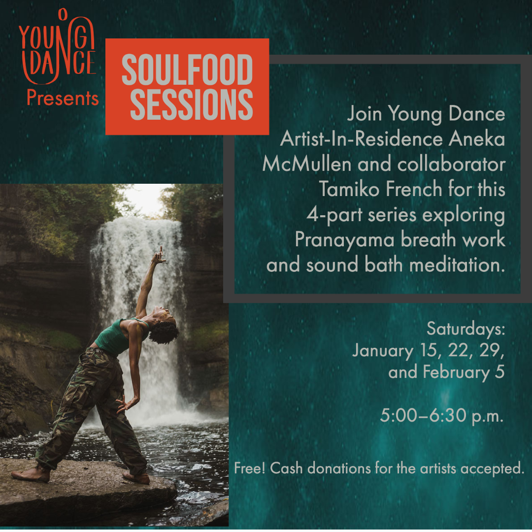 Join Young Dance Artist-In-Residence Aneka McMullen and collaborator Tamiko French for this four-part series, Soulfood Sessions, exploring pranayama breathwork and sound bath meditation.