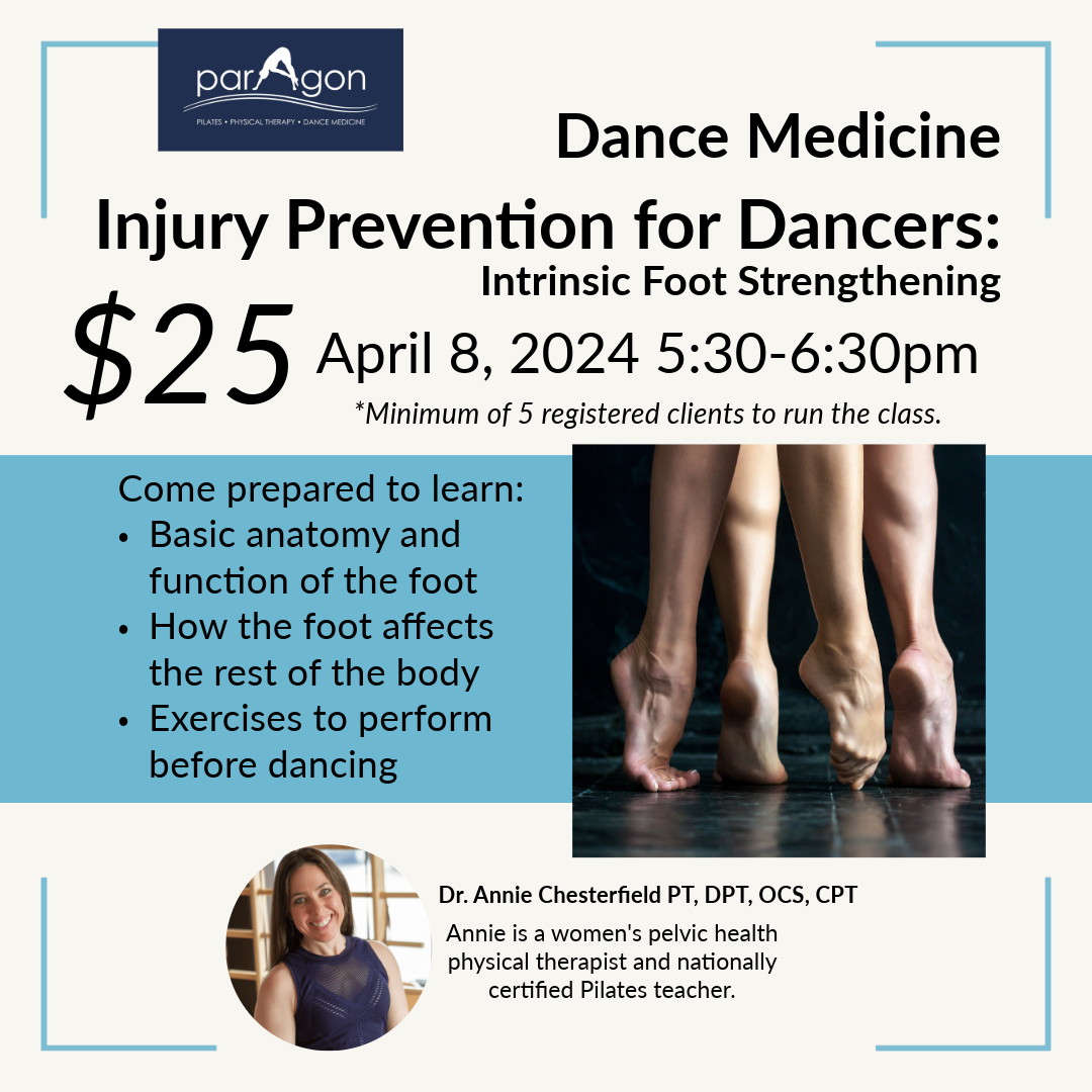 Taught by Dr. Annie Chesterfield PT, DPT, OCS, CPT. Annie is a women’s pelvic health physical therapist with a special interest in dance medicine and a nationally certified Pilates teacher.