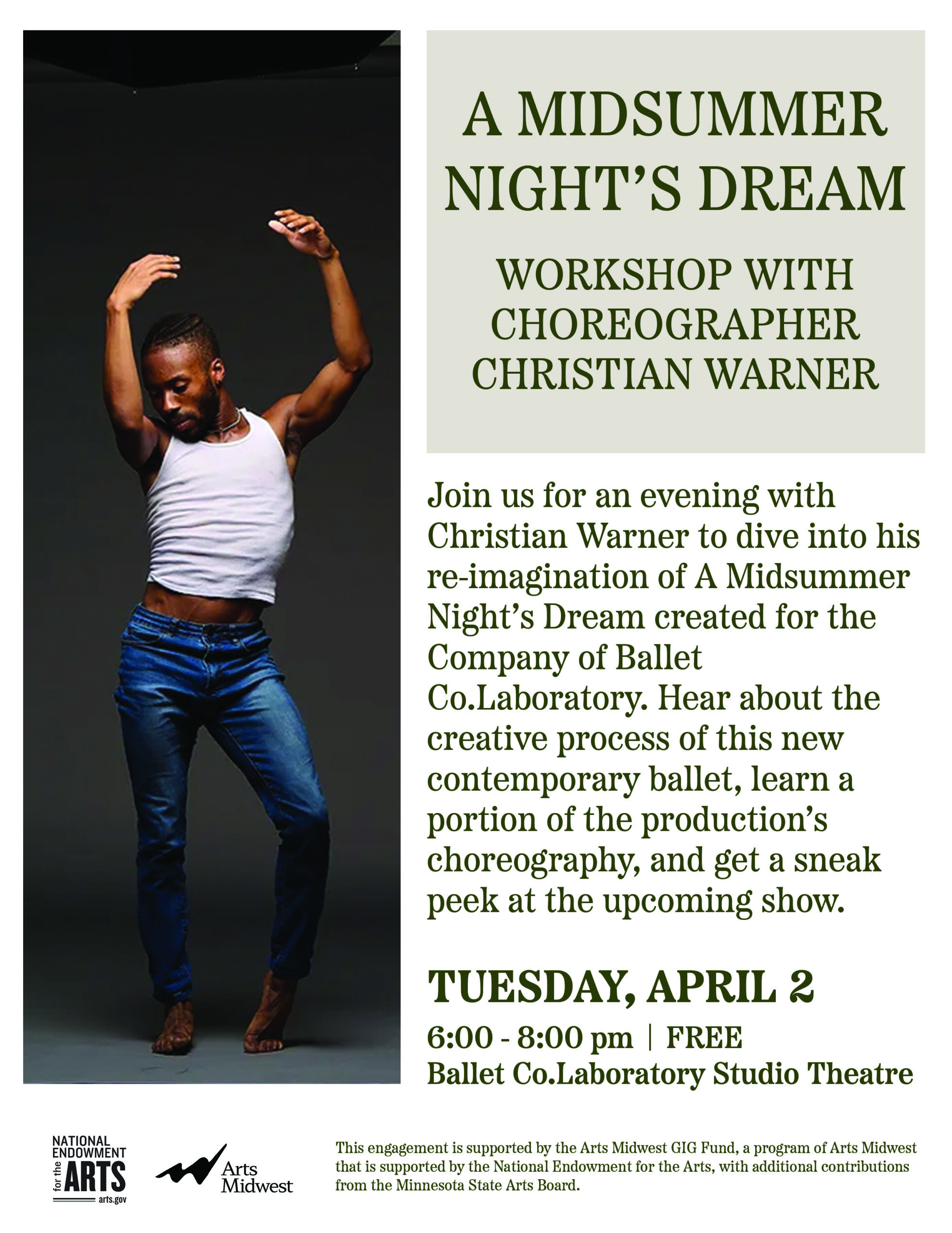 Hear about Christian’s creative process and get a sneak peek at the world-premiere production. You’ll have the opportunity to learn a piece of choreography from the show!