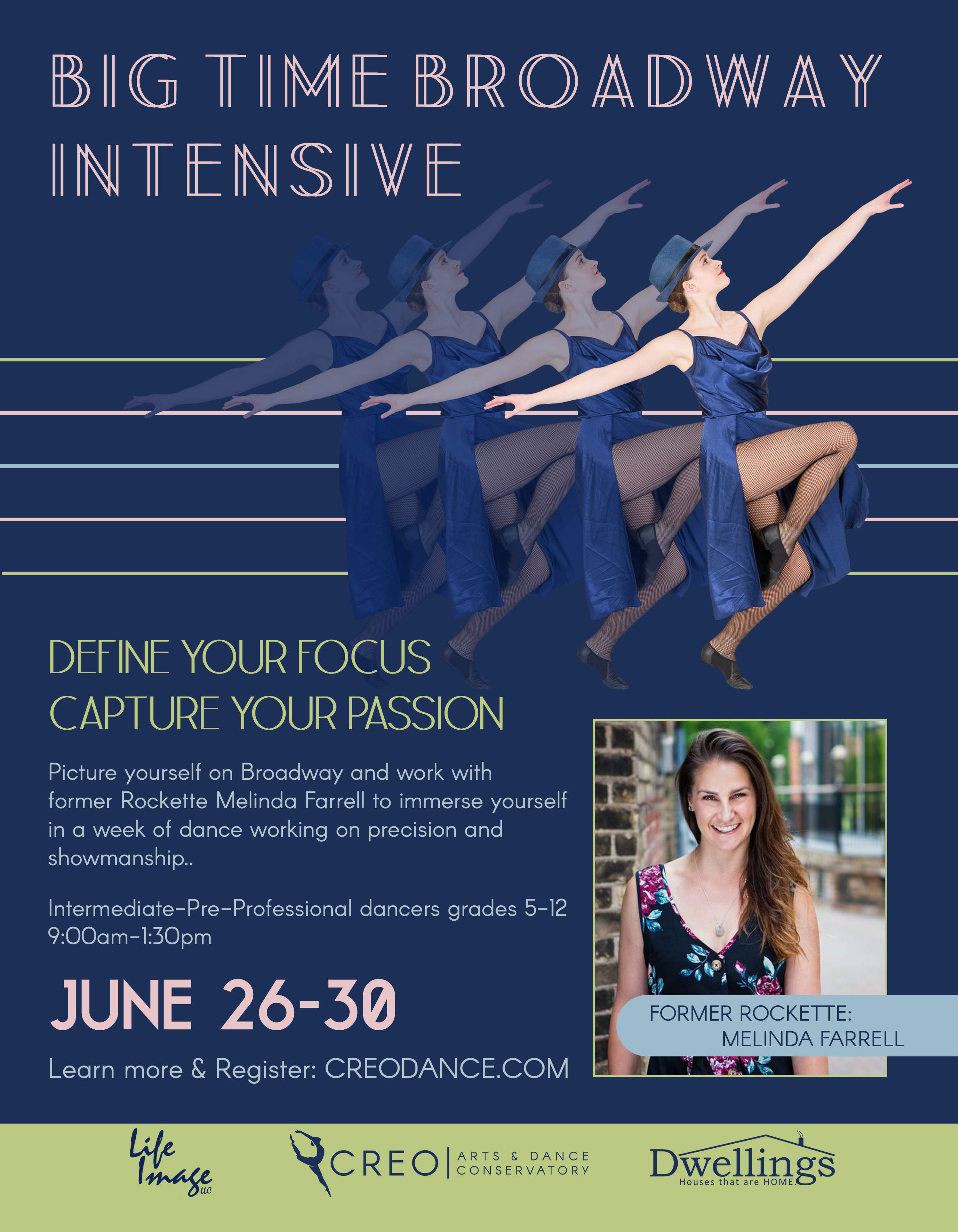 Work with former Rockette Melinda Farrell as well as other industry professionals. Come razzle dazzle ’em and immerse yourself in a week of dance and theatre technique. Train like a Rockette, working precision and showmanship. Learn challenging show-stopping choreography and polish leaps and turns. This camp is a must for those who desire a challenge.